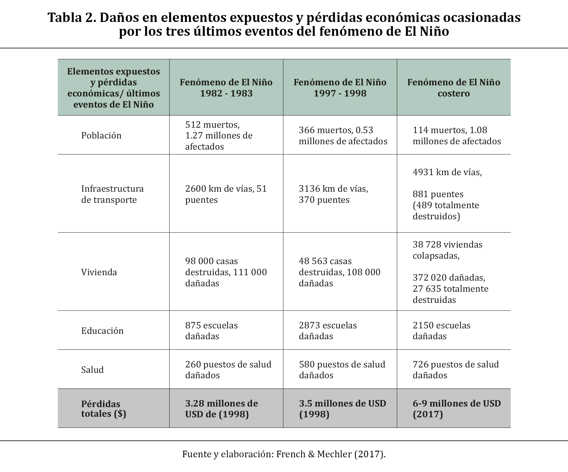 Con la finalidad de comparar el efecto de El Niño costero con los dos eventos que lo antecedieron, la tabla 2 detalla los impactos económicos, así como en elementos expuestos (población, viviendas, entre otras infraestructuras y servicios básicos).