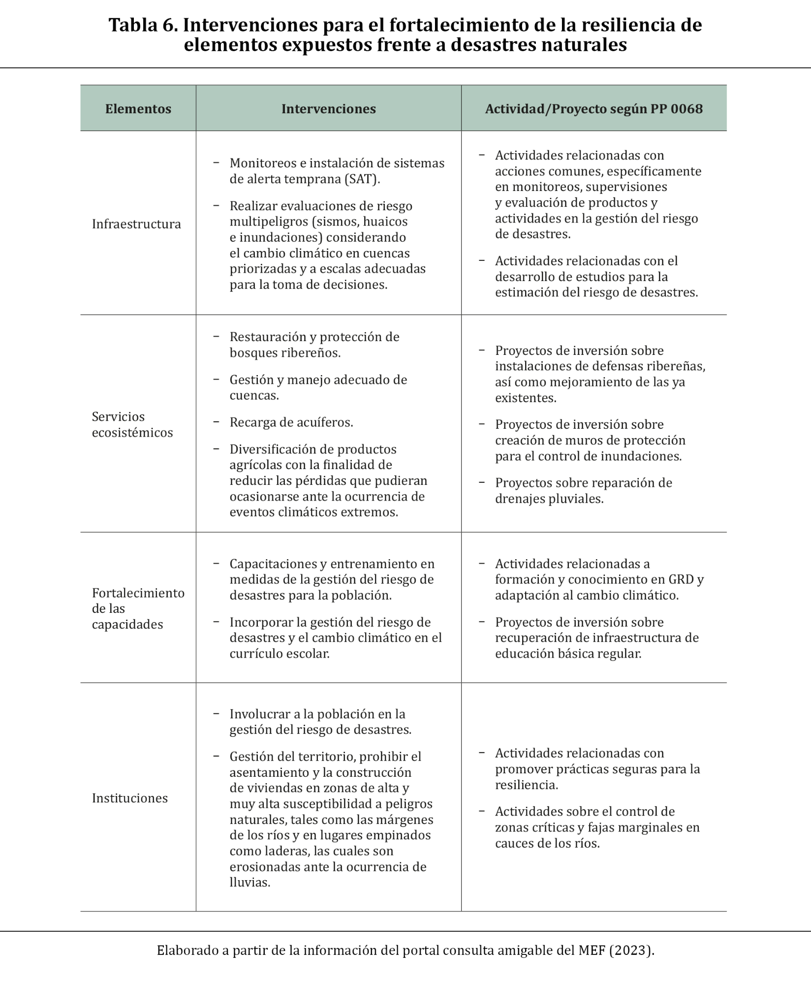 La inversión en fortalecer la resiliencia se puede canalizar en un conjunto de intervenciones en elementos tales como infraestructura, servicios ecosistémicos, fortalecimiento de capacidades e instituciones. Asimismo, tales medidas planteadas pueden ajustarse a los proyectos de inversión o actividades que se contemplan en la asignación presupuestaria PP 0068 del Perú.