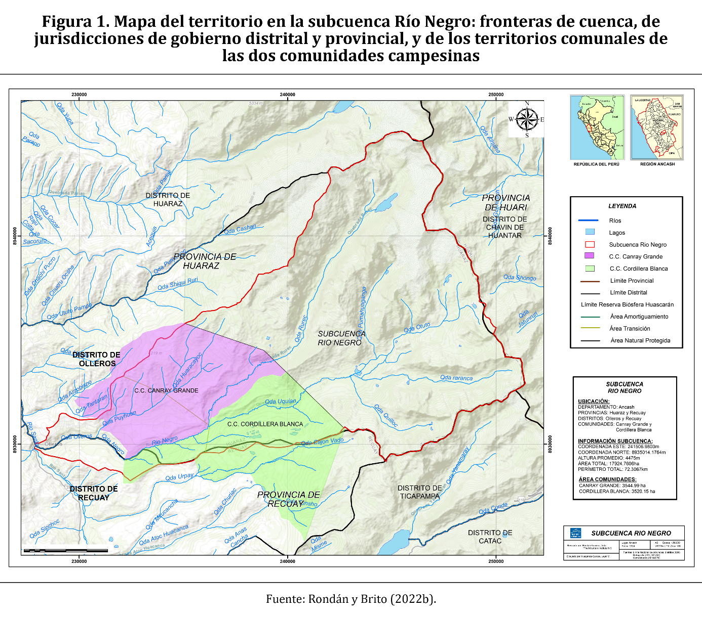 Río Negro es una de las 41 subcuencas de la Reserva de Biosfera Huascarán. Presentar la complejidad de este espacio menor de la reserva (233 km2) pone en perspectiva la dificultad de alcanzar la meta de seguridad hídrica en la cuenca mayor del río Santa. La primera observación es que las fronteras de cuenca, jurisdicciones de gobierno y de comunidades no coinciden (Figura 1). La comunidad campesina (CC) de Canrey Grande cubre tres quebradas (Q.) de la subcuenca Río Negro (Puyhuan, Huaracayo y Rurec) y una en otra subcuenca al norte (zona alta de Q. Tantarán). Todo el territorio comunal está en las jurisdicciones del distrito de Olleros y provincia de Huaraz. La CC Cordillera Blanca abarca la Q. Uquián en la subcuenca Río Negro y una segunda, la Q. Cajón Vado, zona alta de Urpay, fuera de esta subcuenca. La mitad del territorio de la CC Cordillera Blanca está en el distrito de Olleros (provincia Huaraz) y la otra mitad en el distrito de Recuay, provincia de Recuay. La subcuenca misma está toda en el distrito de Olleros, Huaraz. Las quebradas de la comunidad Cordillera Blanca proveen agua a tres canales y la de Canrey Grande a tres, un total de seis canales principales, además de una Junta Administradora de Servicios de Saneamiento (JASS) y dos Comités de Usuarios de Pastos Naturales (CUP). Hay dos grupos de investigación campesina (CIAL), uno de ellos con más de quince