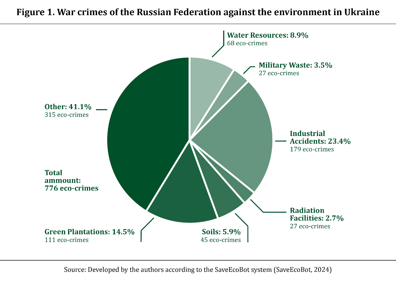 Even such an obvious crime of the Russian Federation as the destruction of the Kakhovka dam are difficult to prosecute. Experts point out that even if there are legal grounds (United Nations, 1977), the question of classification remains open: in terms of intentional actions, it is a violation of the positive obligation to protect civilian infrastructure, and in terms of deliberate actions, it is an act of indiscriminate violence (European Parliament Research Service, 2023). Furthermore, the prospect of bringing Russia to justice for environmental crimes is not affected by the lack of international regulation itself, but by the lack of an effective mechanism to prosecute the offenders to justice. It should be noted that in March 2022, Russia's membership in the Council of Europe was suspended (Council of Europe, 2022b). It continues to be a member of the UN, but this in no way restrains it from violating relevant international agreements. According to the SaveEcoBot system, as of March 2024, 762 environmental crimes committed by the Russian Federation in Ukraine were recorded (Figure 1).