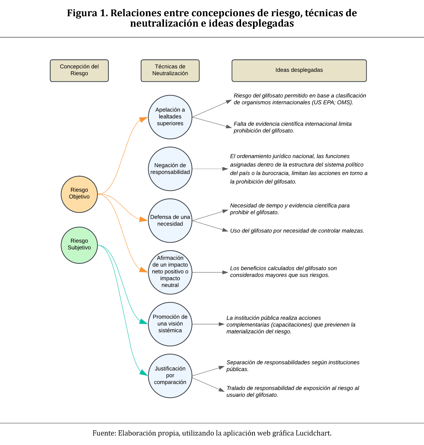 En dicho marco, se pudo identificar que la neutralización del riesgo por el uso del glifosato, desde la posición de los actores gubernamentales participantes, sucedió mediante el despliegue de seis técnicas. Identificar tales técnicas permitió comprender que el riesgo por el uso del glifosato en el Perú es neutralizado argumentando sobre la base de la influencia de agentes externos (por ejemplo, organismos internacionales o el sistema jurídico nacional que condiciona la promulgación de normas) o la defensa de determinadas necesidades (por ejemplo, control de malezas o falta de evidencia científica para sustentar una toma de decisiones). Así, la teoría de la neutralización empleada permitió identificar a detalle las racionalizaciones desplegadas para justificar la no prohibición del uso del glifosato en el Perú.