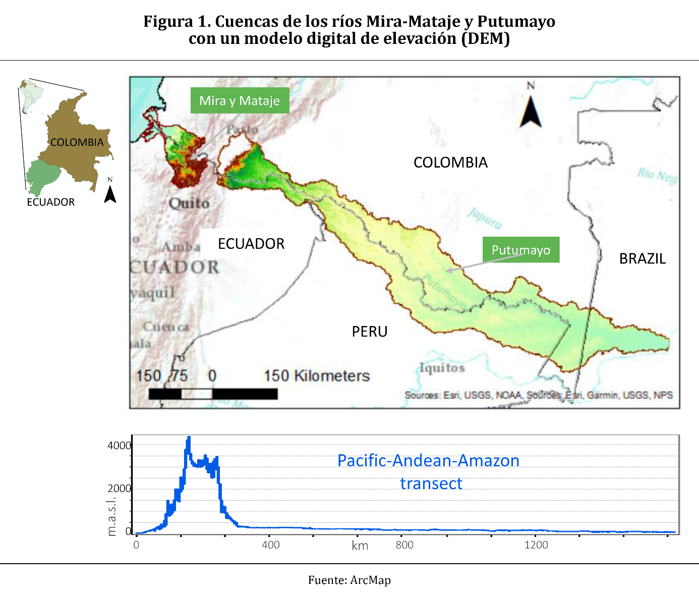 En la Figura 1, el mapa ilustra las cuencas de los ríos Mira-Mataje y Putumayo con un modelo digital de elevación (DEM). La elevación se representa mediante un gradiente de colores que va del blanco, para las altitudes más altas, al verde claro, para las áreas más bajas. La cuenca Mira-Mataje se caracteriza por cambios de elevación pronunciados, con regiones de gran altitud que se transforman en zonas costeras bajas. En contraste, la cuenca del Putumayo muestra una vasta extensión de tierras bajas, dispersas, con elevaciones moderadas cerca de sus cabeceras. Esta representación visual resalta la diversidad topográfica de ambas cuencas y sus distintos rangos altitudinales, brindando un contexto espacial para las características ambientales e hidrológicas.
