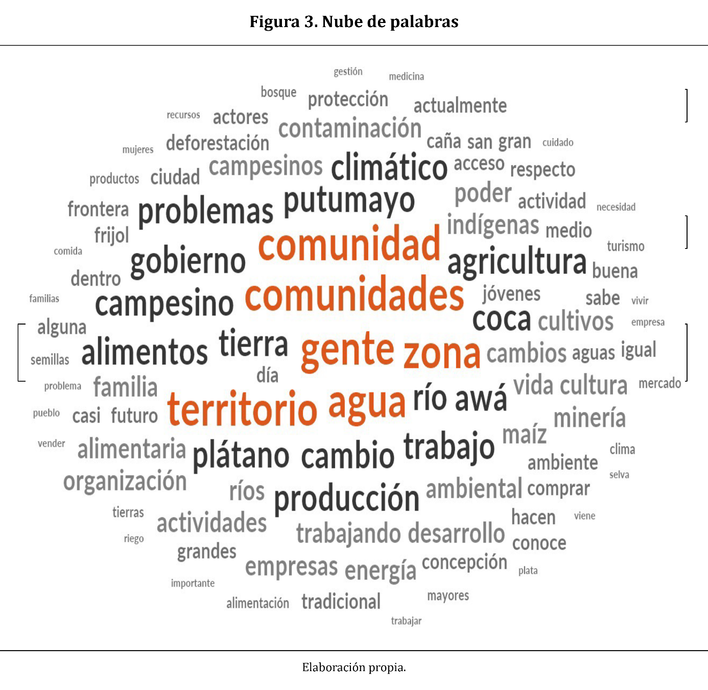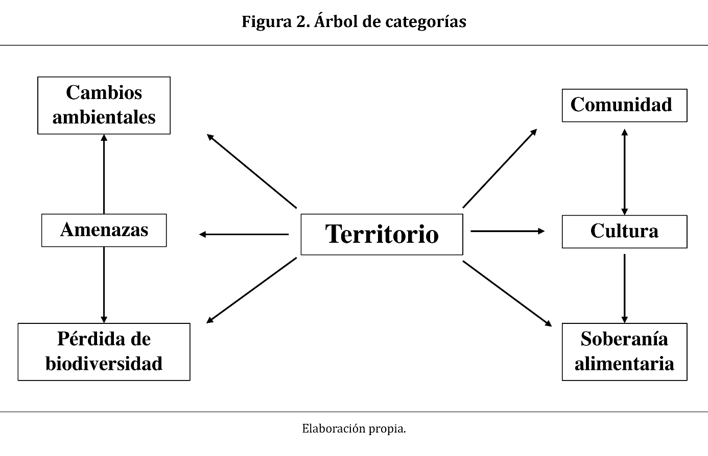 Como puede observarse, en la Figura 3 hay dos categorías que resultan centrales en el discurso de las personas entrevistadas: «comunidad» y «territorio». La Figura 2 presenta el árbol de categorías identificadas durante la «codificación selectiva». La categoría territorio fue seleccionada como la central, tanto por su importancia empírica (Figura 3), como por su relevancia teórica para la ecología política latinoamericana (sección 2.2).