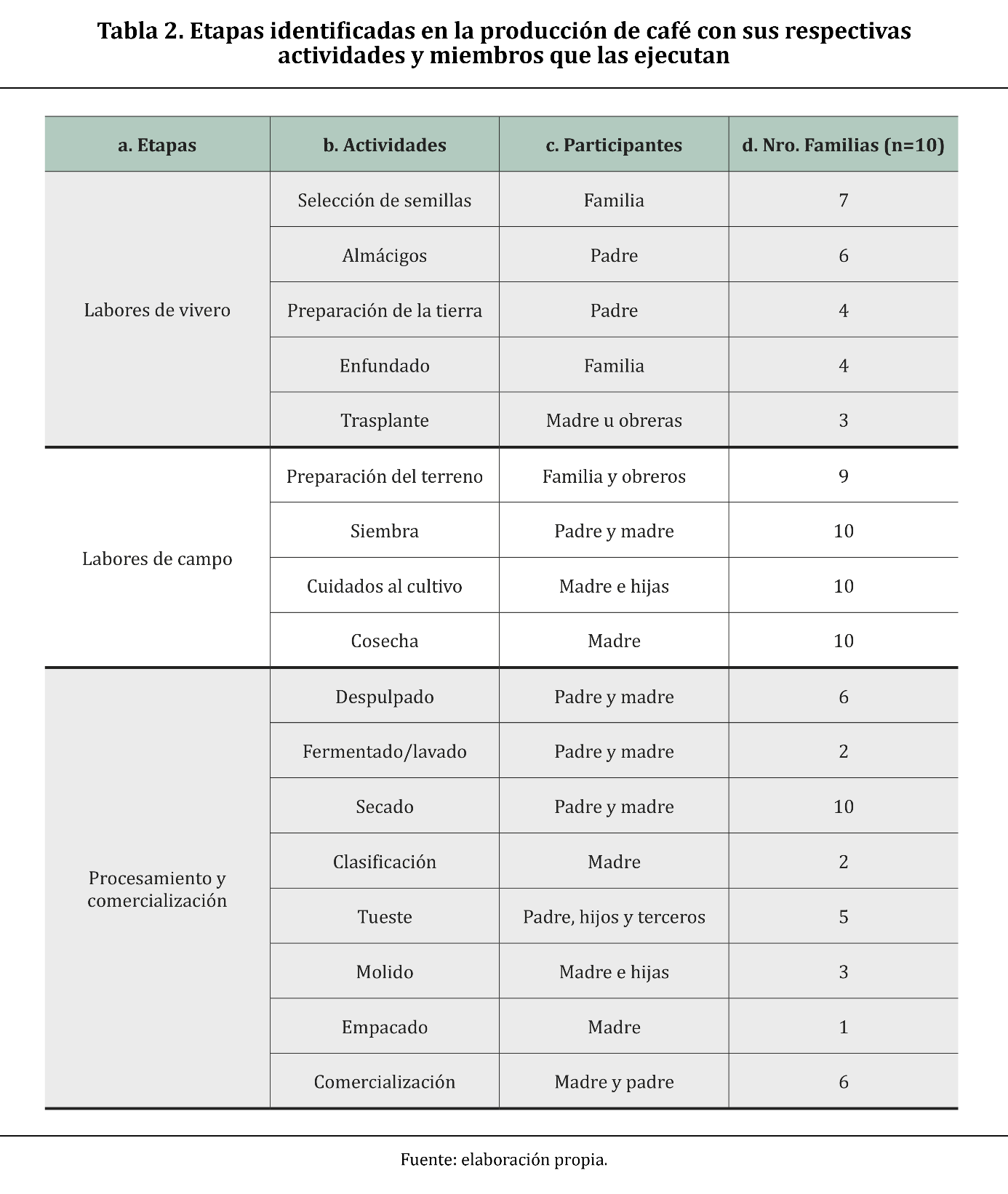 Se identificaron tres etapas en el proceso de producción del café: labores de vivero, labores de campo, y procesamiento y comercialización. Cada etapa involucra actividades específicas, como se detalla en la Tabla 2. Se registraron 17 actividades, aunque solo algunas familias se involucran en todas ellas. La participación está determinada por dinámicas de poder y género arraigadas en normas sociales sobre lo que es apropiado para cada género. Además, se caracterizan por el trabajo familiar compartido.