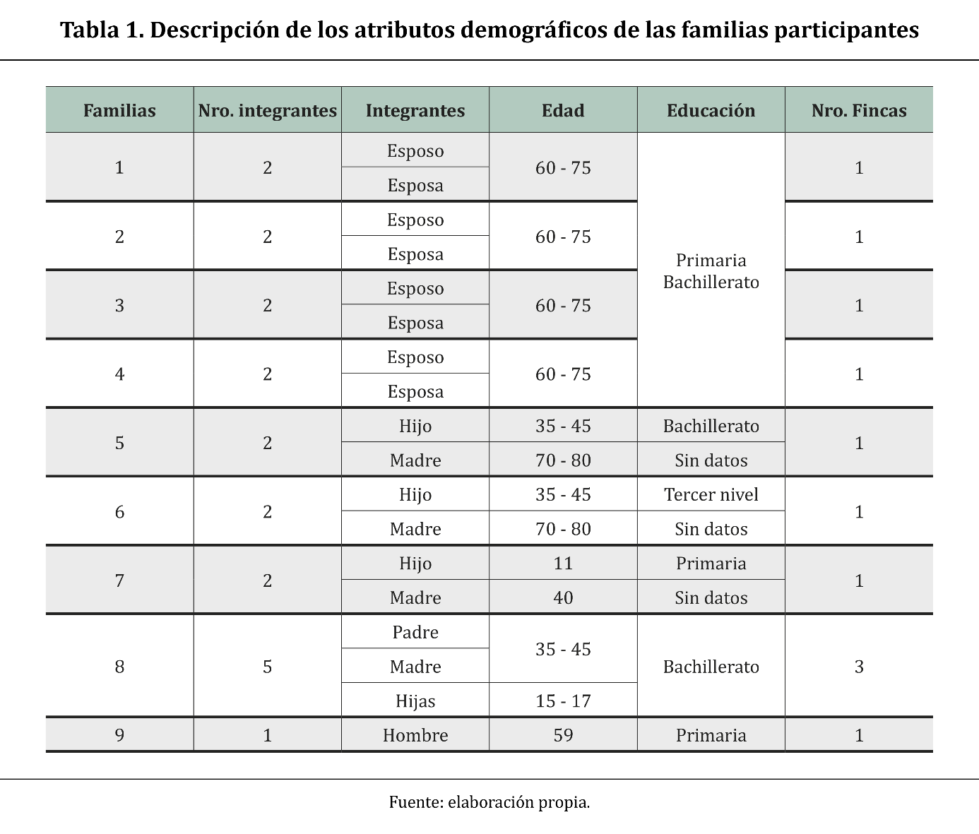 El conocimiento obtenido de las entrevistas informales orientó la estructuración de una guía de preguntas sobre la producción y comercialización del café, desde la selección de semillas hasta la venta. Las preguntas se centraron en los roles de género, los desafíos relacionados con eventos de cambio climático y las medidas de adaptación. Posteriormente, a través de un muestreo dirigido, se realizaron nueve entrevistas semiestructuradas paralelamente con observaciones no participantes de las actividades de café exploradas, con un tamaño de muestra definido por saturación. La unidad de muestreo fue la familia. La Tabla 1 detalla los perfiles de los informantes.