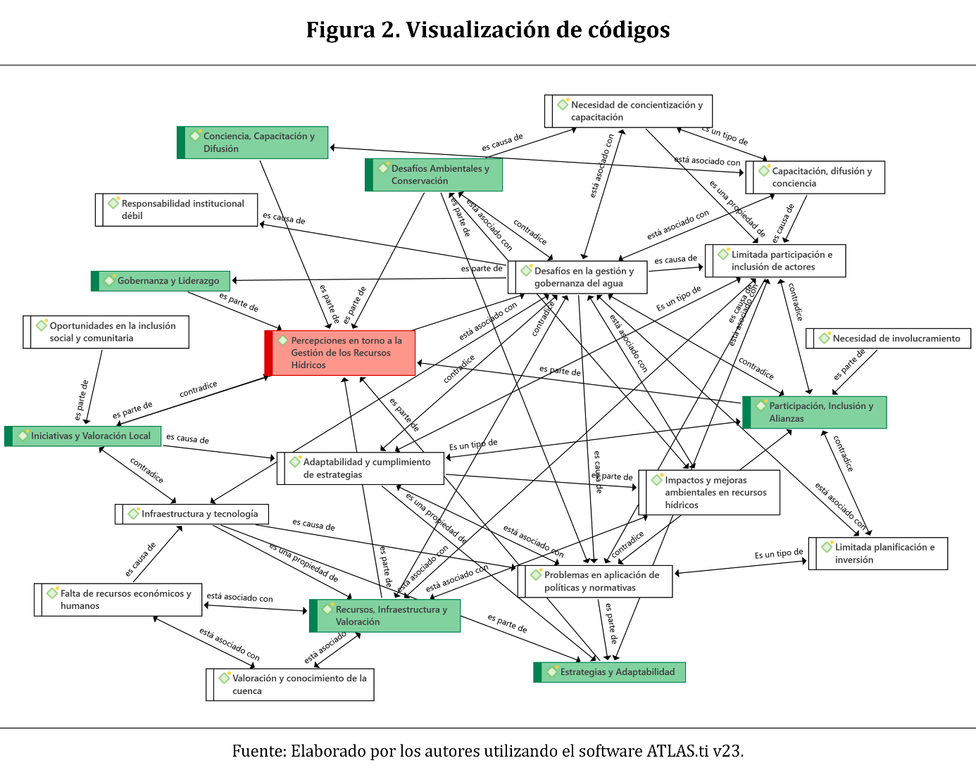 El estudio ha identificado temas distintos que describen la situación del estado en que se encuentra la GIRH en la Amazonía peruana desde la percepción de los actores sociales de la cuenca Cumbaza en la región San Martín. A través del análisis temático reflexivo, emergieron siete áreas que estructuran la comprensión del fenómeno desde la voz de los actores sociales involucrados. Es importante señalar que estas áreas no siguen un orden determinado ni representan un momento definitivo. Esto se debe a la variabilidad inherente a las experiencias personales, ya que la transición de cada actor de la cuenca es particular. Las áreas identificadas son: (1) participación, inclusión y alianzas; (2) recursos, infraestructura y valoración; (3) desafíos ambientales y conservación; (4) iniciativas y valoración local; (5) conciencia, capacitación y difusión; (6) gobernanza y liderazgo; y (7) estrategias y adaptabilidad (Figura 2).