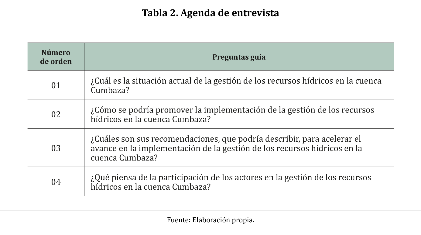 La técnica utilizada fue la entrevista en profundidad semiestructurada. Durante la fase de desarrollo se elaboró una guía de entrevista —teniendo en cuenta el objetivo del estudio— dirigida a funcionarios, servidores públicos, empleados y representantes de instituciones, organizaciones, sociedad civil y academia. Esta guía abarcó temas como: situación actual, promoción y recomendaciones para acelerar la implementación de la GIRH y el pensar sobre la participación de los actores en la gestión del agua. Las preguntas se refieren a los aspectos de conocimiento y percepción, desafíos y barreras, recursos y herramientas, estrategias de sensibilización, colaboración interinstitucional, mejoras en políticas y regulaciones, capacitación y educación, roles y responsabilidades, y mecanismos de participación. Las preguntas se plantearon en relación con las perspectivas de los participantes sobre el fenómeno investigado. La guía de entrevista se sometió a un proceso de auditoría en el que participaron tres jueces, seguido de una prueba piloto para ajustar su redacción y orden lógico (Tabla 2).