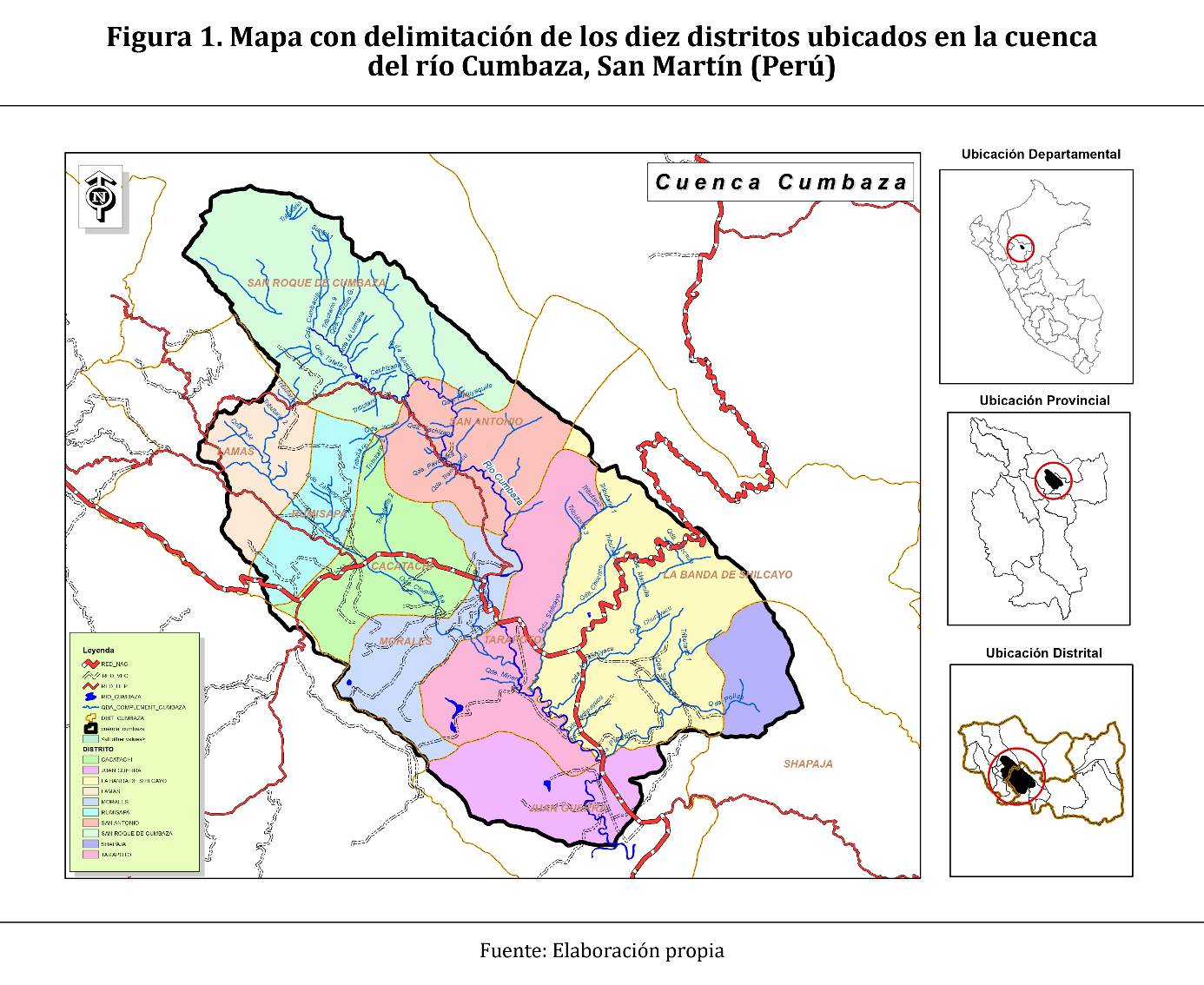 La investigación se desarrolló en la cuenca del río Cumbaza (Figura 1), ubicada en la región San Martín, Perú. Esta cuenca abarca las provincias de Lamas y San Martín, incluyendo los distritos de Lamas, San Antonio, San Roque de Cumbaza, Tarapoto, La Banda de Shilcayo, Morales, Juan Guerra, Cacatachi, Rumisapa y Shapaja. La población total supera los 194 000 habitantes, según el Instituto Nacional de Estadística e Informática (INEI, 2018).