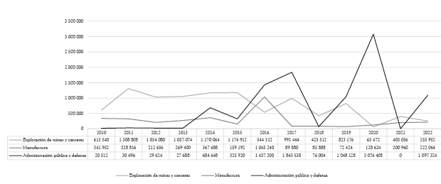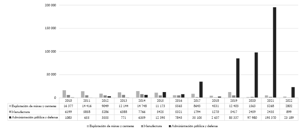 Si desde el punto de vista de la frecuencia se observan tímidas cifras, los datos relativos al número de huelguistas muestran un correlato, pero solo hasta la primera mitad de la década pasada (figura 2). Nótese, además, que en ese quinquenio el sector que lidera la movilización de trabajadores es el minero, superando ampliamente al de manufactura —la segunda industria que registra mayor conflictividad—. Es en el segundo quinquenio que se observa un salto cuantitativo relevante en la Administración pública. En particular, desde 2017, las organizaciones de trabajadores del sector público han empezado a liderar las movilizaciones. Un último detalle para destacar es que la inmovilización social obligatoria producto de la pandemia de COVID-19 no tuvo un efecto importante en este sector en particular, pero sí en otros17. Como se puede observar, tanto en manufactura como en minería se registró una ínfima cantidad de huelguistas.
