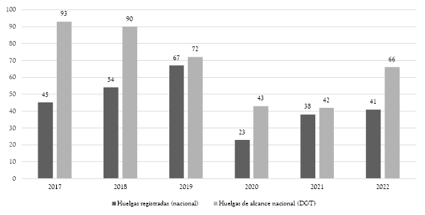 Figura 4. Huelgas registradas a nivel nacional y huelgas de alcance nacional registradas ante la DGT (2017-2022)
