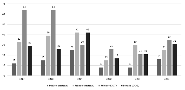 A través de una solicitud de acceso a la información, la DGT remitió 418 expedientes correspondientes a procedimientos de huelga iniciados desde 2017 hasta 2022. Estos documentos han sido luego clasificados por año, codificados y tabulados según tipo de sector (público/privado), motivo de huelga, duración, procedencia y legalidad, y autoridad resolutoria, utilizando el software Microsoft Excel. Esta información ha permitido un mayor escrutinio sobre los registros estadísticos, así como identificar ciertos detalles en los patrones de estrategias de acción a nivel legal. Asimismo, a partir de ello se ha evidenciado un subregistro en la frecuencia o número de huelgas en todos los años cubiertos en este trabajo (2017 a 2022). En concreto, se ha observado que en este intervalo temporal la cantidad de expedientes de acciones colectivas ante la DGT supera ampliamente el número total registrado a nivel nacional3. En otras palabras, sin contabilizar a las veinticinco direcciones regionales, el número de procedimientos de huelga de alcance nacional excede los datos registrados para todo el país en el anuario estadístico del MTPE4.