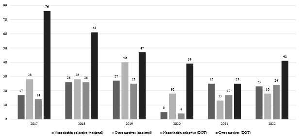 Figura 6. Huelgas registradas a nivel nacional y huelgas de alcance nacional registradas ante la DGT según motivo del conflicto (2017-2022)