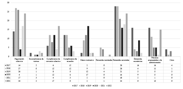 Por otro lado, interesa señalar que esta investigación se aleja de la clasificación normativa de los motivos de huelga5, toda vez que resulta insuficiente para apreciar la plétora de motivos de luchas sindicales a nivel nacional. Asimismo, también se ha evitado recurrir a categorías6 amplias que puedan subrepresentar o sobrerrepresentar cierto tipo de causas (Cuevas, 1990). En ese sentido, las denominaciones empleadas rescatan los criterios clásicos (negociación colectiva, incumplimiento de normas) e incorporan otros como «prácticas empresariales o de la administración», «marco normativo», «demandas nacionales», «demandas económicas», «demandas sectoriales», «cumplimiento de convenio colectivo», «cumplimiento de acuerdos», etc.