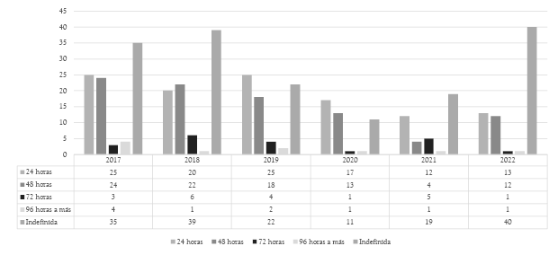 Ahora bien, a partir de la información obtenida se observa que alrededor del 56 % de las huelgas iniciadas ante la DGT tienen una duración igual o menor a los tres días; es decir, se trata de movilizaciones de corta duración. Asimismo, un 61 % incumple el requisito de preaviso establecido en la legislación22. Desde esta perspectiva, las organizaciones de trabajadores optan por recurrir a movilizaciones breves y por incumplir los plazos legales de preaviso para su materialización. La finalidad de esta acción es evitar que el aparato administrativo pueda truncar la medida de fuerza y restarle eficacia. Desde esta perspectiva, se observa que la insistencia por mantener la huelga en el marco de la legalidad a través de los recursos de apelación o revisión (Santistevan & Delgado, 1980) ha virado hacia la evasión del control administrativo por medio de huelgas rápidas que aprovechan la falta de capacidad de respuesta estatal para su beneficio.