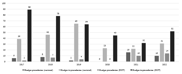 Nota 1: no todos los procedimientos de huelga registran, necesariamente, una resolución de improcedencia. En algunos casos la DGT no llega a pronunciarse a tiempo y solo se tiene registro de la comunicación (preaviso). También hay ciertos supuestos en los que la huelga es intempestiva y se emite directamente una resolución de ilegalidad. Asimismo, también se registran algunos desistimientos de la medida de fuerza que no generan un pronunciamiento de la autoridad. En ese sentido, no necesariamente coincide la frecuencia con el número de procedencias e improcedencias.