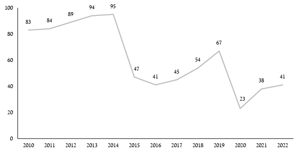 Por su parte, la ilegalidad de la huelga grafica una tendencia descendente durante todo el periodo estudiado y muestra los registros más ínfimos en los últimos dos años, 2021 y 2022 (figura 11). Este hecho podría discutir el argumento de la independencia política; no obstante, enfrenta dos atingencias, una de orden contextual y otra práctica. La pandemia de COVID-19 redujo significativamente la actividad laboral presencial y, con ello, el número de huelgas. En ese sentido, la materialización y posterior constatación de una huelga enfrentaba significativas dificultades, tanto desde el lado de los sindicatos como desde la Administración pública. Asimismo, como se ha señalado, en el caso de las medidas de fuerza de corta duración se vuelve inviable la posibilidad de verificar su ejecución debido a los plazos previstos por la LRCT.