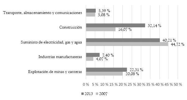 Con relación al primero, se observa que la introducción de la planilla electrónica no interfiere o rompe con la tendencia descendente del alcance de los convenios colectivos. La trayectoria descendiente que se identifica inicia en 2006, dos años antes del uso obligatorio de esta herramienta; y se mantiene hasta 2013, año en el que termina por ubicarse debajo de la densidad sindical. En ese sentido, con esta nueva herramienta se confirma la existencia de una cobertura de negociación colectiva superior a la tasa de afiliación, así como el paulatino descenso del primer indicador.