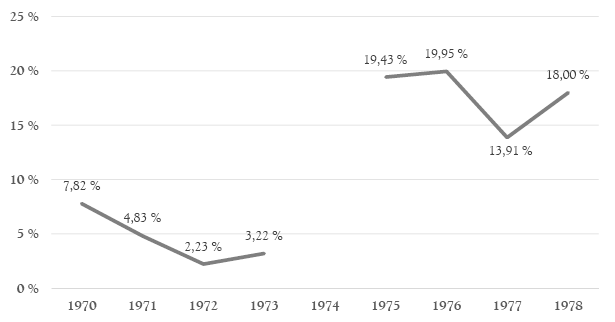 Ahora bien, como se desprende del diseño, los resultados de este modelo generaron un evidente impacto positivo en el desenvolvimiento de los conflictos económicos. De acuerdo con Sulmont (1985), la cobertura de la negociación colectiva, aunque fue baja durante los primeros dos años, se elevó luego significativamente, llegando a cerca del 20 % de la población económicamente activa (PEA) asalariada (p. 206). La figura 1 refleja dicha afirmación y muestra la evolución de la tasa de cobertura de la negociación colectiva entre 1970 y 1978.