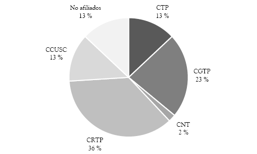 Por otro lado, de acuerdo con la figura 3, la mayoría de las organizaciones de trabajadores, tanto a nivel de empresa como de rama, se encuentran afiliadas a confederaciones nacionales8. Así, es posible afirmar que existía cierto grado de coordinación o estructura sindical de alcance nacional. Asimismo, cabe anotar que la fragmentación que se registra en este año es una constante y expresa las diferentes posiciones políticas de las dirigencias (ejemplo de ello son la Confederación de Trabajadores del Perú [CTP] y la Confederación General de los Trabajadores del Perú [CGTP]), así como las intenciones del gobierno de turno de cooptar el movimiento sindical (como en el caso de la Central de Trabajadores de la Revolución Peruana [CRTP])9. Finalmente, esta distribución entre las confederaciones resulta interesante dado que para 1976 tanto la CGTP como la CRTP tenían pocos años de constituidas. Desde esta perspectiva, es posible afirmar que los sindicatos buscaban nuevos espacios de participación a nivel nacional.