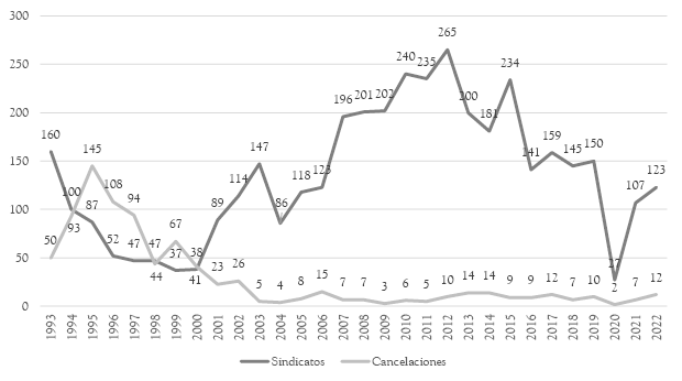 Figura 4. Evolución del registro sindical a nivel nacional (1993-2022)