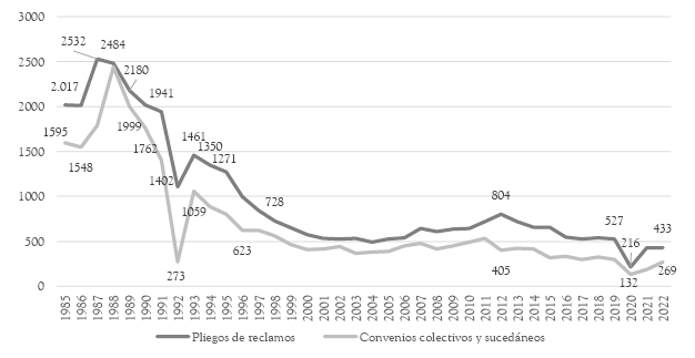 Figura 6. Pliegos de reclamos y convenios colectivos y sucedáneos (1985-2022)