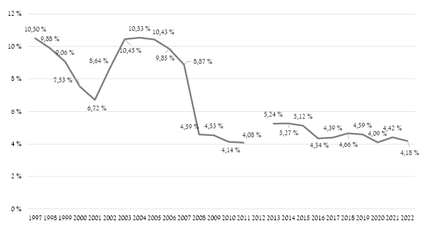 Figura 5. Tasa de afiliación sindical (1997-2022)