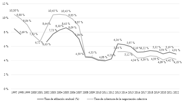 Figura 9. Tasa de afiliación sindical y cobertura de la negociación colectiva (1997-2022)