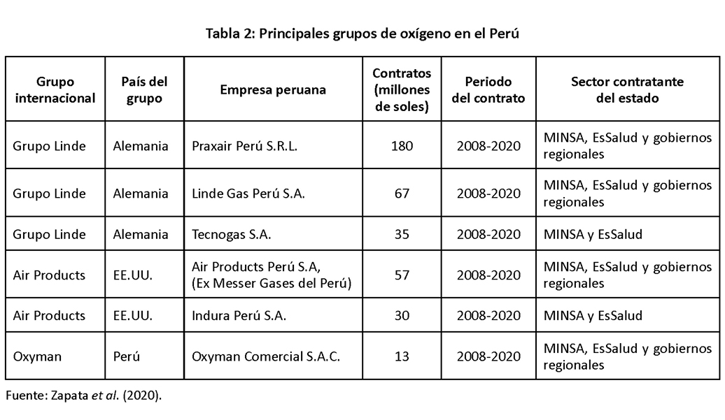 La Defensoría del Pueblo advirtió que el mercado de oxígeno en el Perú se encuentra altamente concentrado, pues solo son dos compañías que se reparten la mayoría de la producción de oxígeno de alta pureza (con lo cual se trata de un duopolio), estas son el Grupo Praxair Perú (que tiene entre el 82% y el 85% de producción) y el Grupo Air Products Perú (que tiene entre el 15% y 18%) (2020, p. 10). Asimismo, tal como revela la información recopilada por la Defensoría del Pueblo, estas “son las empresas matrices de los mayores abastecedores de oxígeno medicinal al Estado, según información del Organismo Supervisor de las Contrataciones del Estado” (2020, p. 10).