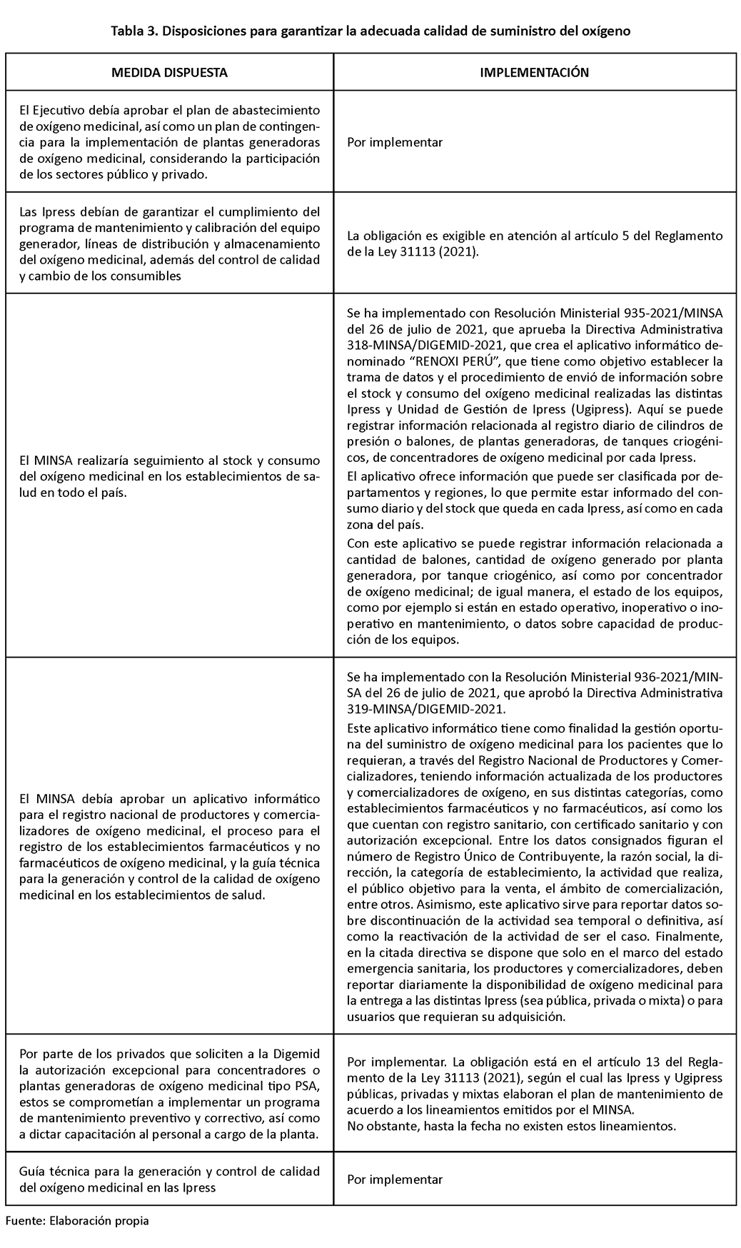 Entonces, en el contexto de la segunda ola de la pandemia por el COVID-19 en el Perú, se eliminó la barrera burocrática referida al alto grado de pureza del oxígeno que se requería, pero, para garantizar la calidad del oxígeno medicinal, se emitieron varias disposiciones que son resumidas en la Tabla 3.